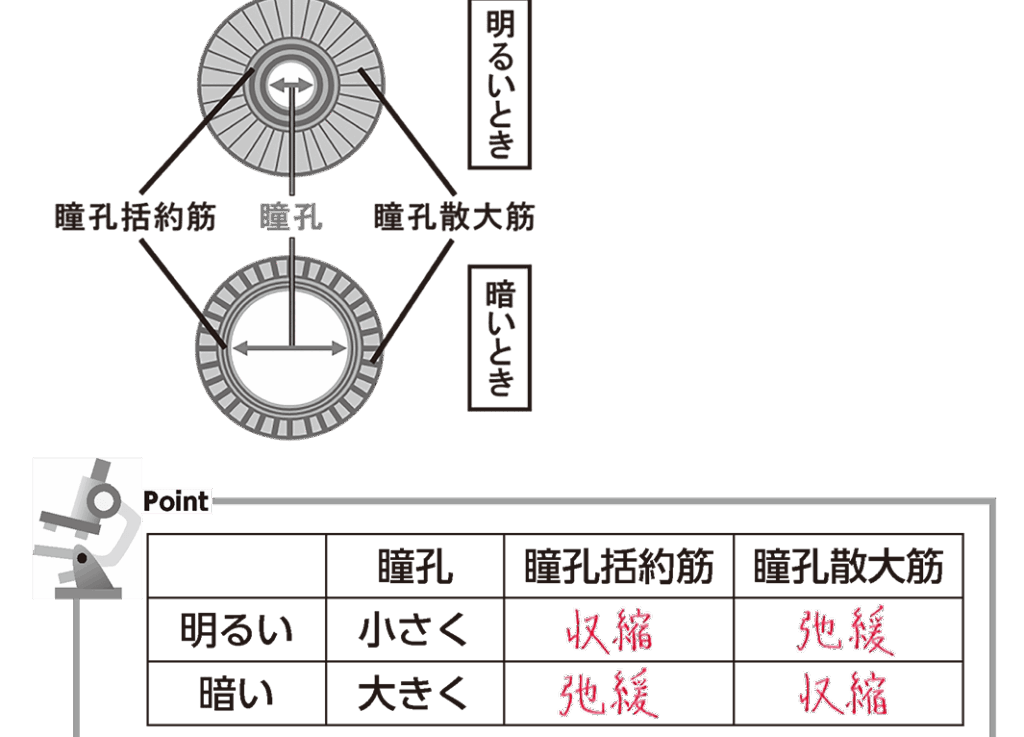 瞳孔は、周囲の明るさに応じて大きさを調整する。明るい場所では、瞳孔は縮小し、目に入る光の量を減らす。