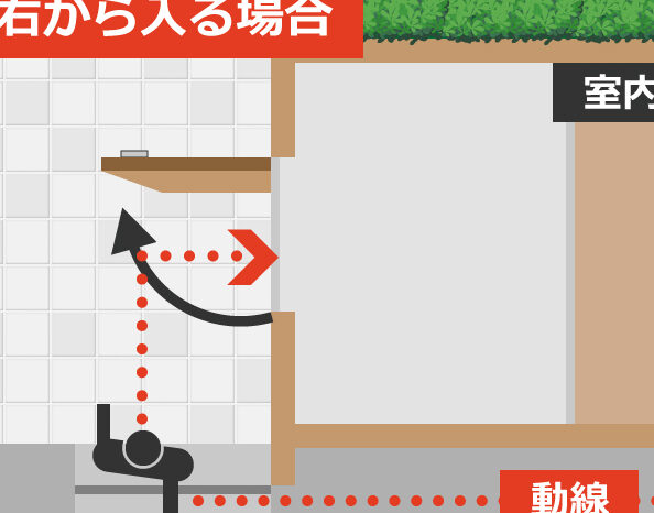- 通行の利便性を優先します。外開きドアは、スムーズな出入りが可能です。