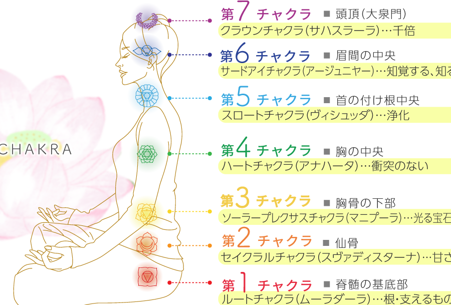 私たちの身体には主に7つのチャクラがあります。それぞれのチャクラは異なる役割を果たし、以下の通りに分類されます。