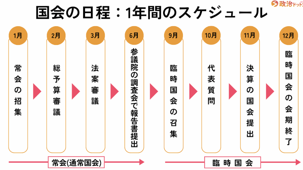 - 臨時国会: 内閣判断で適宜招集されるため、そのタイミングは不定期です。