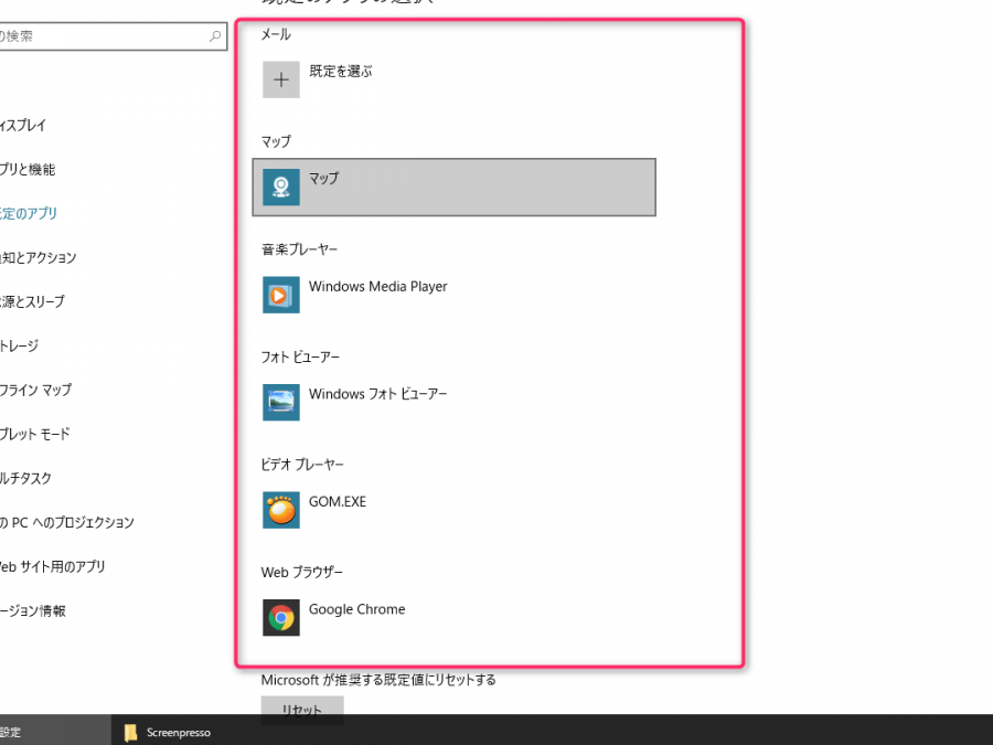 左側のメニューから「既定のアプリ」を選びます。