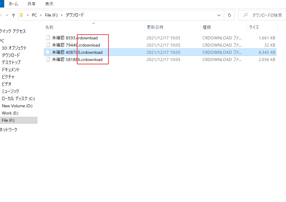 - crdownloadファイルを選択する。 拡張子が「.crdownload」となっているファイルを右クリックします。