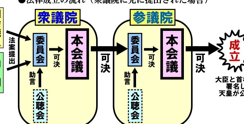- 法案の提出:衆議院または参議院で法案が提出される。