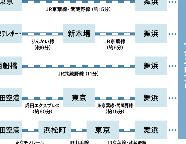 JR京葉線「舞浜駅」で下車し、から徒歩約15分です。