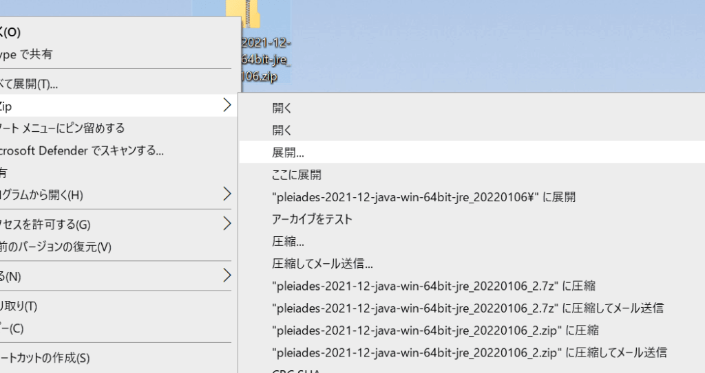 - 「ファイル」メニューから「開く」を選択します。 または、対象の7zファイルを右クリックして、「7-Zip」メニューから「ここに解凍」を選びます。