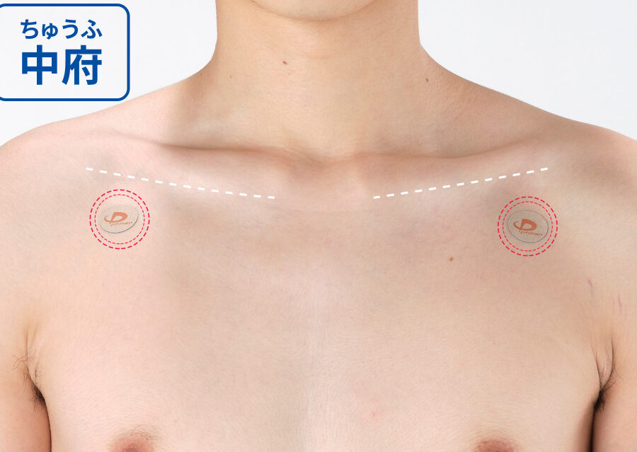 - 膻中(だんちゅう)も同様に行う。胸の中央あたりで、ゆっくりと圧力をかけます。1分間続けます。
