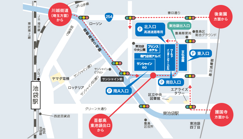 池袋駅から徒歩でのアクセスが良く、バスや車でのアクセスもスムーズです。特に、東口からのバスは頻繁に運行しており、選択肢が豊富です。