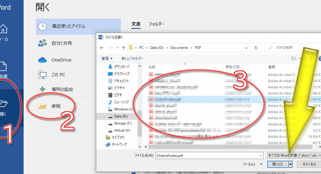- ファイルを選択する。 読み込むPDFファイルを選び、ダブルクリックします。