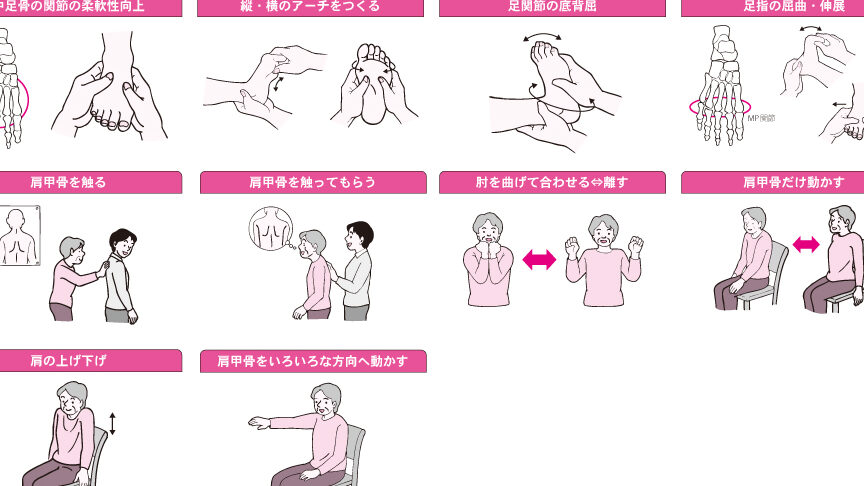 - 基本的な可動域エクササイズから始める。 例えば、腕や脚など簡単な部分から徐々に開始します。