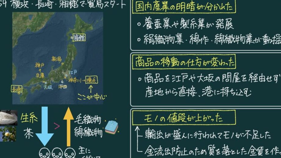 - 外国貿易の促進:日本は国際貿易の一員となり、さまざまな商品が輸入・輸出されるようになった。