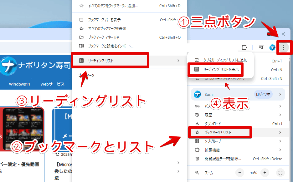 - リーディングリストを選択。表示されるメニューから「リーディングリスト」を選択します。