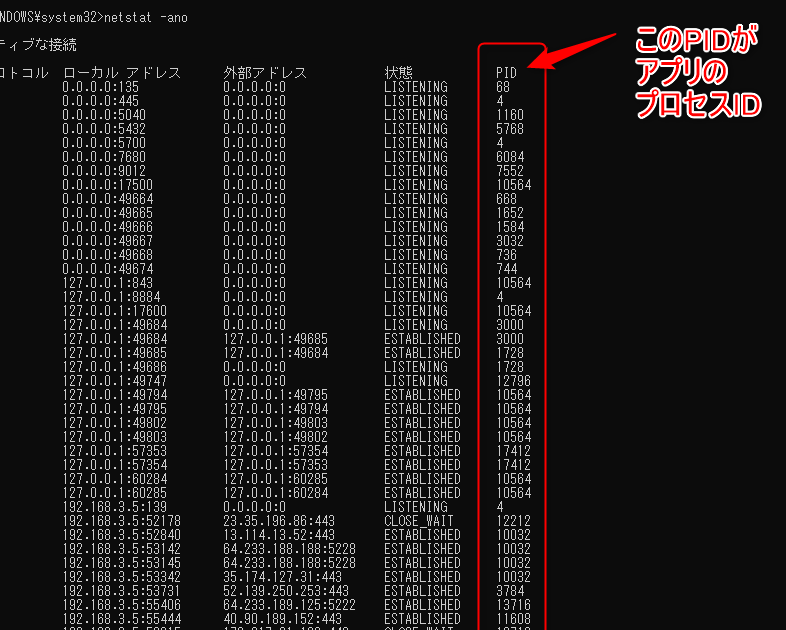 - netstat -anコマンドを入力。 開いているポートの一覧が表示されます。