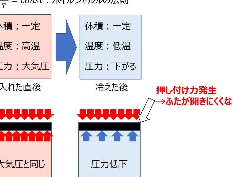 密閉された容器の場合、内圧が蓋をしっかりと押し付けてしまいます。密閉されていると、外部の力では開けにくくなるのです。ここでは、密閉性の主な要因を確認します。