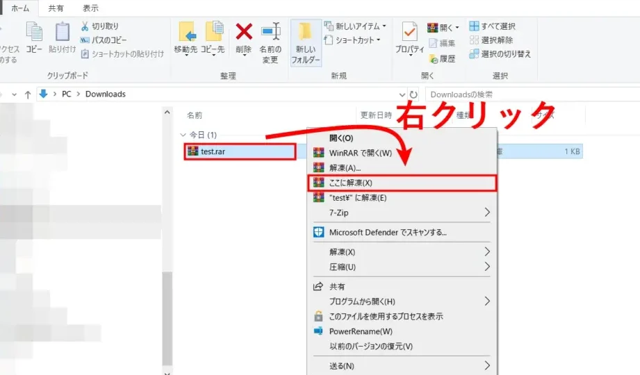 - rarファイルを右クリックし、「ここに展開」または「開く」を選択。